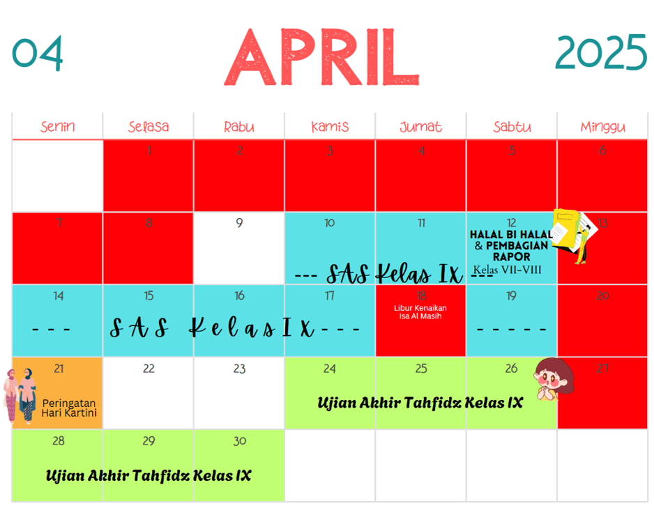 Kegiatan yang dilaksanakan adalah Halal Bihalal, Pembagian Rapor Kelas VII–VIII, SAS (Sumatif Akhir Semester) untuk Kelas IX dan Ujian Akhir Tahfidz Kelas IX